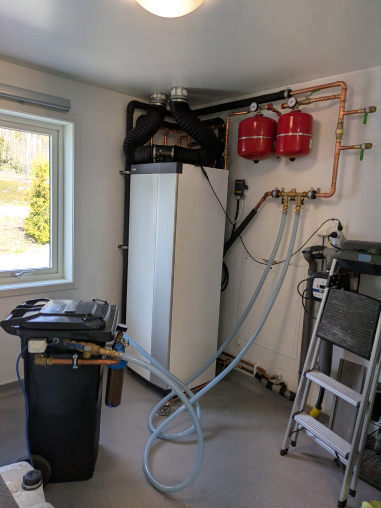 The final step was to run the connections through the house wall and install the actual heat pump along with associated plumbing inside. This happened at the end of April. Since our system was a bit special with the separate connection to the garage (I was going to do the garage work myself later) I had a bunch of discussions with Daniel and Patrik at Lelles to make sure we were on the same page. Patrik (not me) who did the inside installation did a really neat job and in early May we were ready to turn on the new system.
